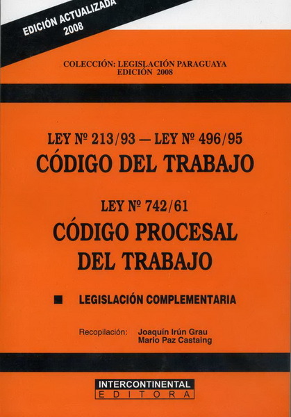 Comentario: Nueva edición actualizada que reúne el Código del Trabajo, junto al Código Procesal del Trabajo del Paraguay y legislación complementaria. Incluye índices del Código del Trabajo y del Código Procesal del Trabajo. La presente edición suprime los comentarios que realizaran los Dres. Joaquín Irún Grau y Mario Paz Castaing a los artículos del Código que fueran modificados por la Ley nº 496/95. Incluye diversos índices.