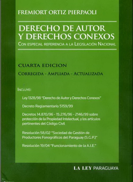 Edición corregida, ampliada y actualizada al año 2011 de la obra que analiza de manera exhaustiva toda la temática referente a los derecho de autor y derechos conexos con especial referencia a la legislación paraguaya. Incluye como anexo normativo la ley nº 1328/98 de Derecho de Autor y Derechos Conexos, decreto reglamentario nº 5159/99 y la resolución 19/04 `Funcioamiento de la A.I.E.´ entre otros textos. Complementado con bibliografía. Ortiz Pierpaoli es Juez de Primera Instancia en lo Civil. Ha publicado numerosas obras.